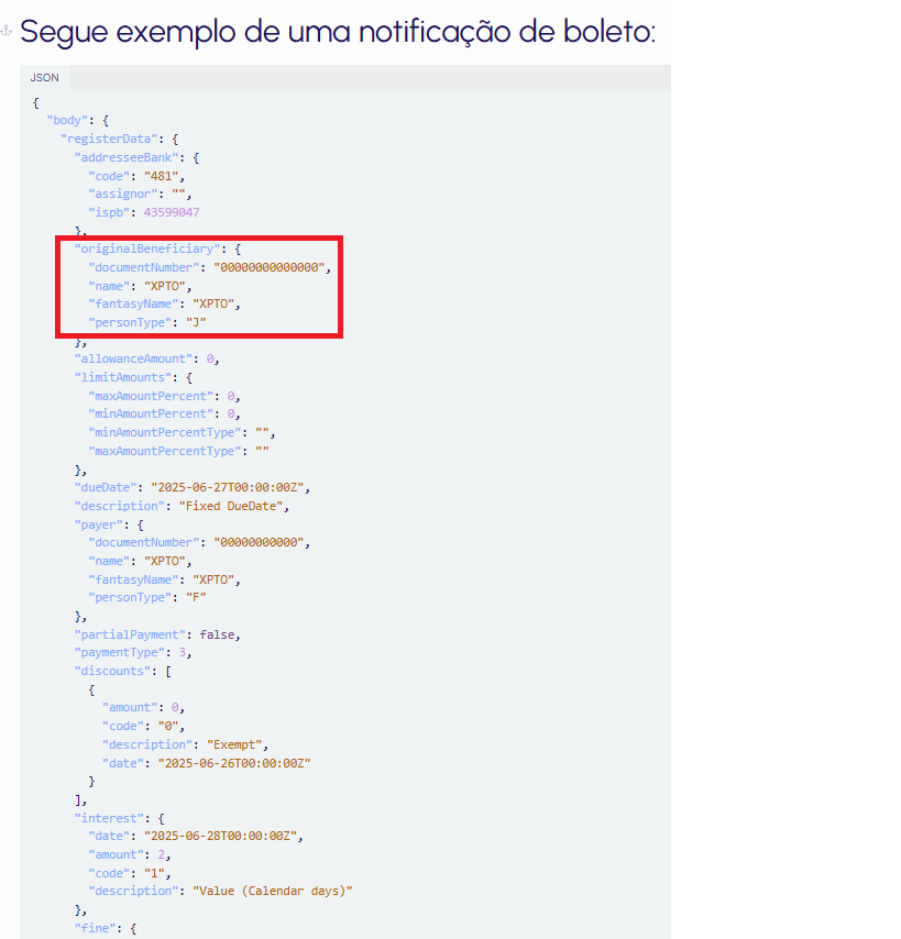 Utilize os parâmetros “name” e “fantasyName” do array "originalBeneficiary" retornados no webhook para informar ao usuário quem é o beneficiário da cobrança registrada no DDA. Veja um exemplo do response: