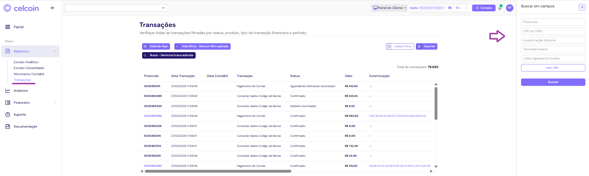 Dependendo do produto selecionado no filtro, você poderá buscar transações por meio de outros campos auxiliares, como protocolo, CNPJ/CPF, autenticação externa e terminal externo.
