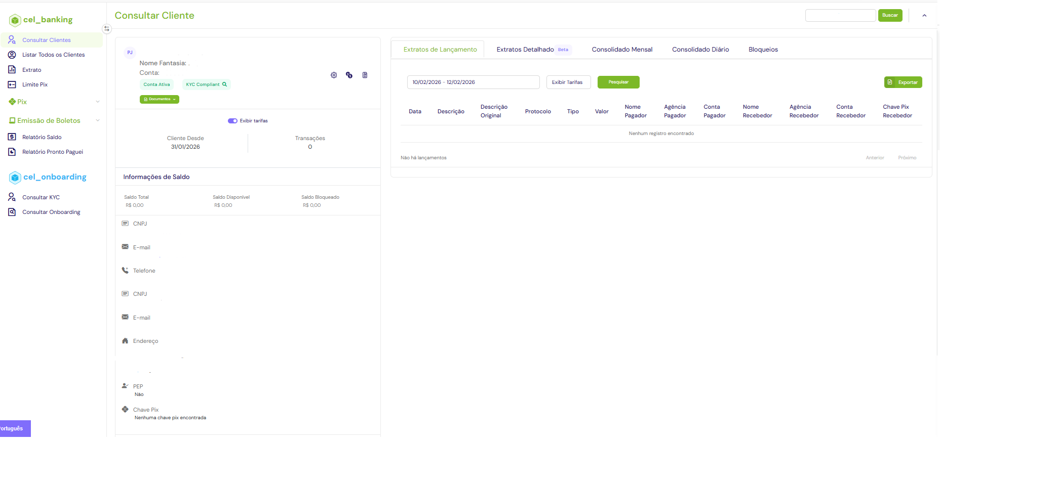 A funcionalidade "Consultar Cliente" permite localizar rapidamente usuários ou contas específicas em nosso sistema. Você pode buscar com base em parâmetros como CPF/CNPJ, número da conta ou nome do cliente.