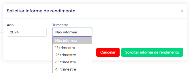 No Painel do cliente selecione a conta do usuário desejado em Consultar Clientes, no menu lateral, clique em Documentos > Informe de Rendimentos, selecione o Ano e o Trimestre desejado. Clique em Solicitar Informe de Rendimentos para baixar o PDF.