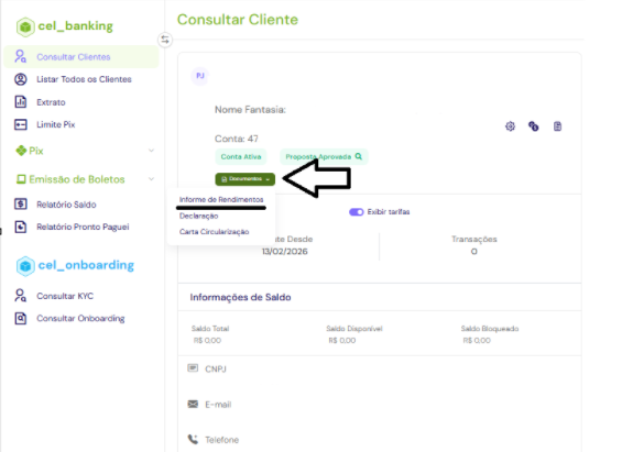 Para garantir a conformidade com a Instrução Normativa nº 698/2006, sua empresa deve fornecer anualmente o informe de rendimentos aos clientes. A Celcoin automatiza esse processo, consolidando os saldos e rendimentos do ano calendário anterior, incluindo a exportação do PDF correspondente.