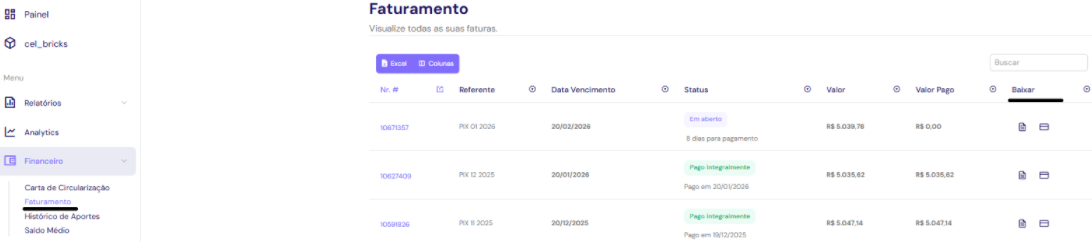 Para visualizar suas faturas, siga o caminho Financeiro > Faturamento. Nesta seção, você pode acompanhar o status de cada lançamento (Em aberto, Pago ou Em atraso) e realizar o download da Nota Fiscal (NF) e do boleto para pagamento.