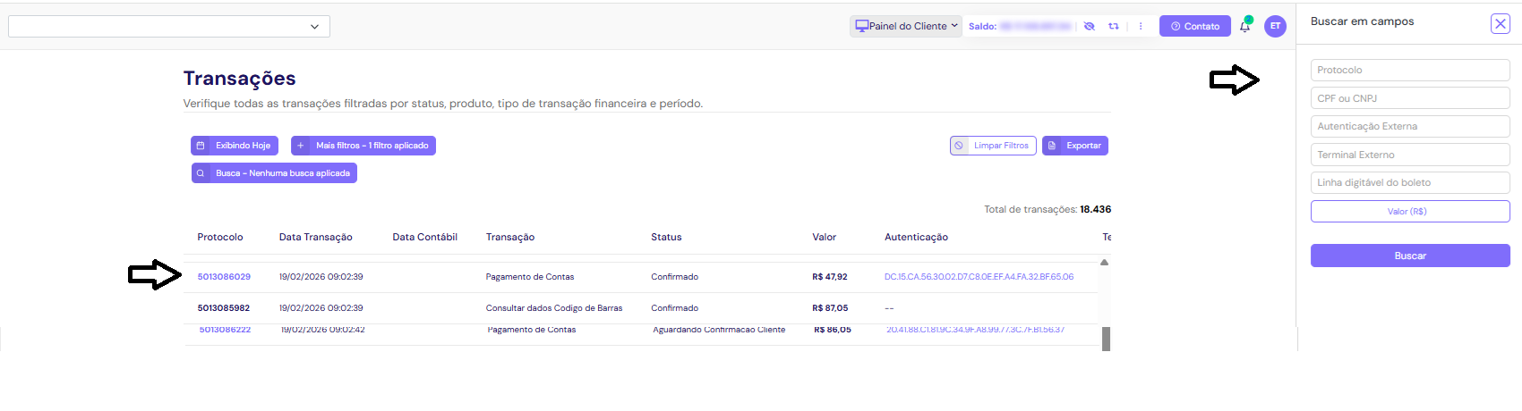 Para localizar uma transação no Painel do Cliente, acesse o menu Relatórios > Transações. Utilize os campos de Busca e Mais filtros para filtrar a consulta ou o pagamento desejado. Ao encontrar a transação, basta clicar sobre o número do protocolo para visualizar o comprovante detalhado da operação.