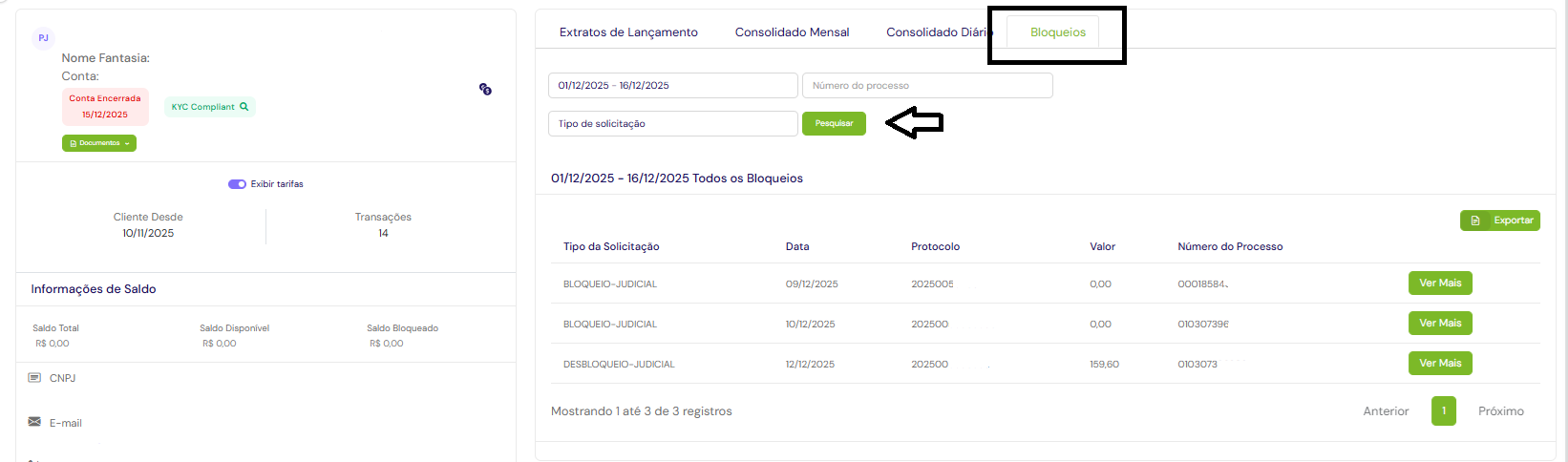 No Painel do cliente disponibilizamos a aba Bloqueios na própria conta do usuário. Nesta seção, você pode consultar detalhadamente todos os bloqueios realizados, incluindo os valores retidos e os respectivos períodos. Além disso, o sistema permite a exportação desses dados em arquivo, facilitando a análise da sua equipe financeira ou jurídica.