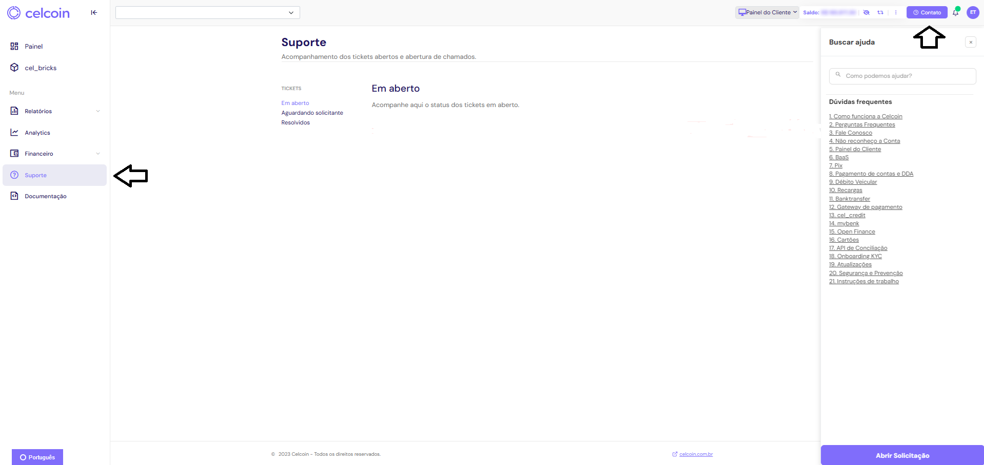No menu do Painel do Cliente, acesse a opção Suporte. Lá, você poderá acompanhar o status dos seus chamados: Em aberto, Aguardando solicitante (quando precisamos da sua resposta) ou Resolvidos.