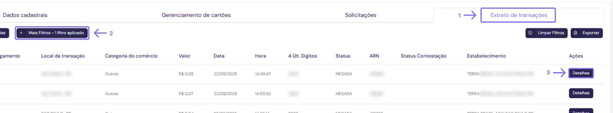 Clique em “Extrato de transações” (seta 1), aplique os filtros desejados para localizar a transação (seta 2) e selecione “Detalhes” (seta 3);