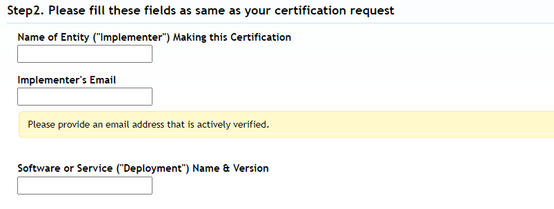 - "Name of Entity ("Implementer") Making this Certification": adicione o nome de registro da sua instituição;