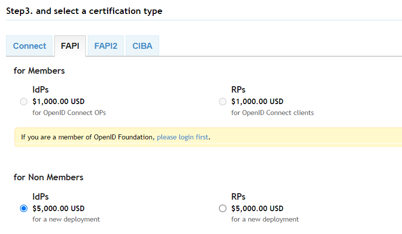 Se a sua instituição for membro da OpenID Foundation, selecione o pagamento em "for Members" e o tipo de certificação, sendo IdPs para Transmissores de Dados e Detentores de Contas e RPs para Receptores de Dados e Iniciadores de Pagamentos.