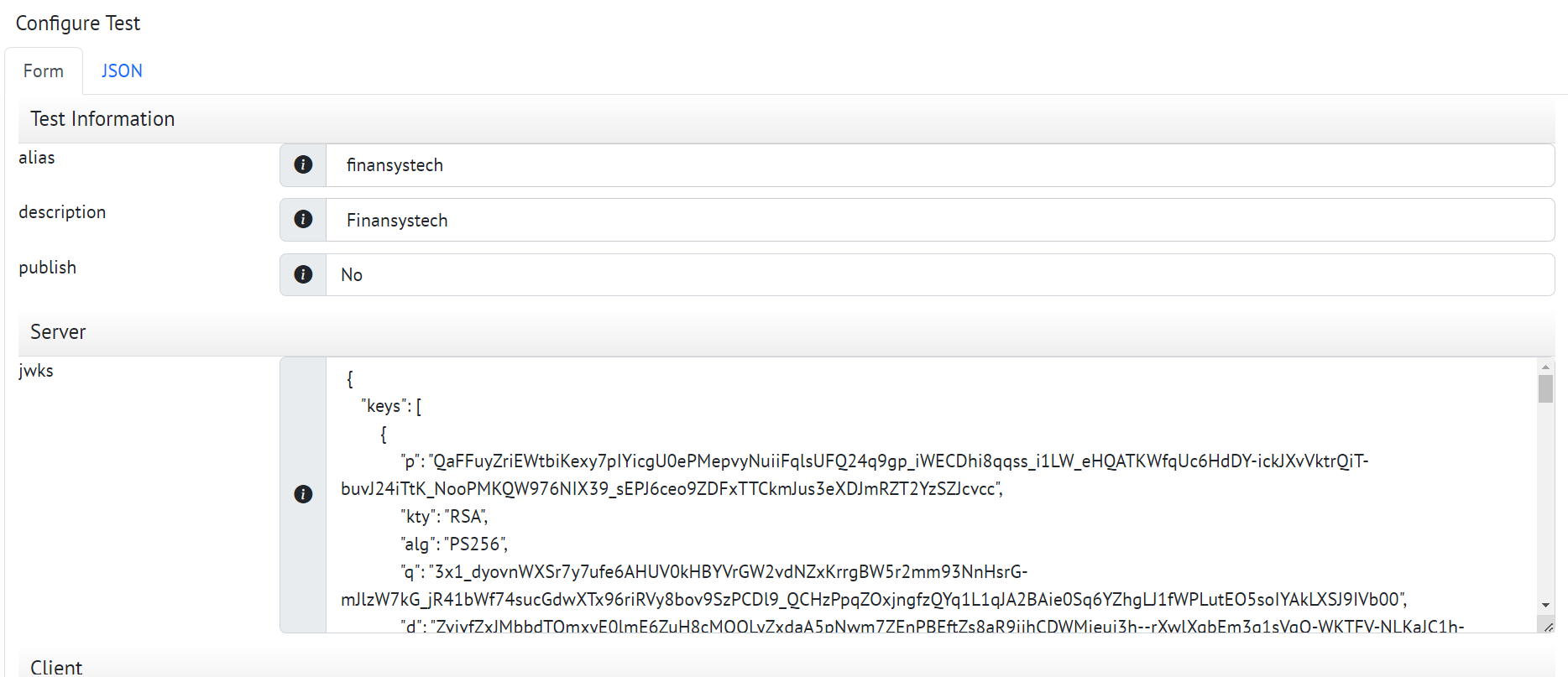 - Em "Configure Test", selecione a aba "JSON" e cole a configuração em formato .json (caso não tenha recebido, solicite o arquivo de configuração em nosso Canal de Atendimento);