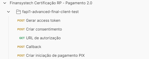 - Escolha a collection "Finansystech Certificação RP - Pagamento 2.0.postman_collection" se você for participante da Fase 3 de Pagamentos do Open Finance Brasil;