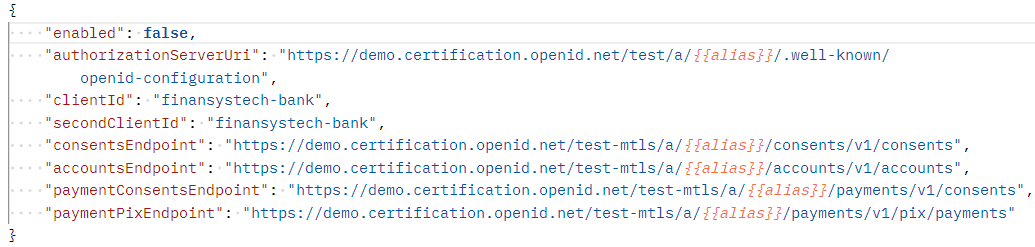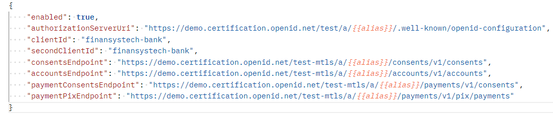 - "consentsEndpoint": cole a url "https://demo.certification.openid.net/test-mtls/a/{{alias}}/consents/v1/consents", e substituia o {{alias}} de acordo com a configuração do teste;
