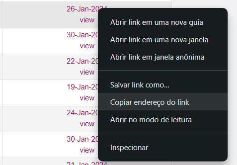 - Encoste o mouse na data das certificações, aperte o botão direito e selecione "Copiar endereço do link":