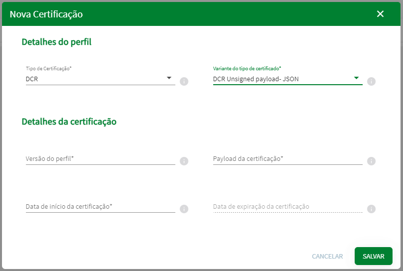- "Variante do tipo de certificado": selecione DCR Unsigned payload- JSON para transmissor de dados;