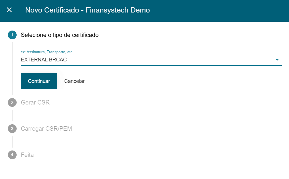 - Em "Tipo do Certificado", selecione "BRSEAL EXTERNAL";