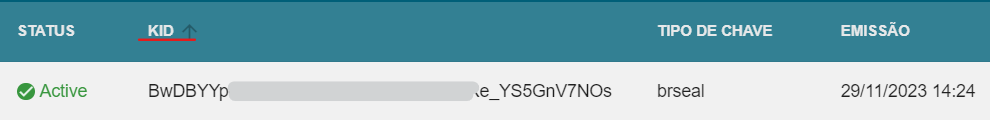 - Identifique o KID na lista de certificados em "Certificados da Organização", conforme exemplo abaixo;