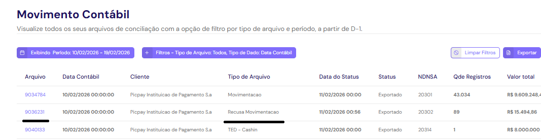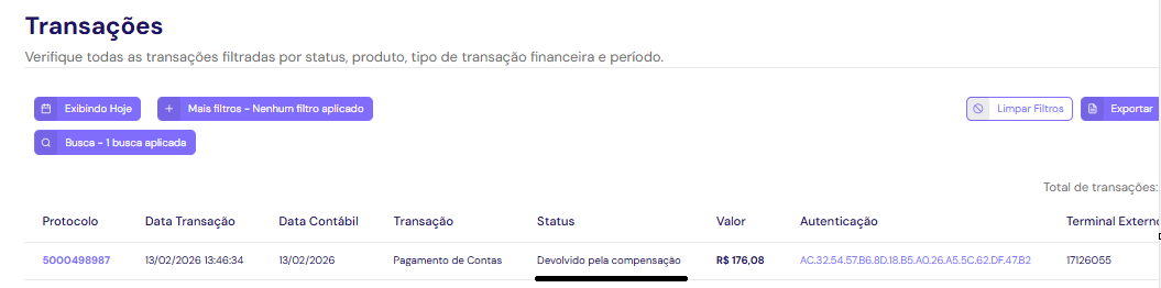 Você também pode consultar o status do pagamento no Painel do Cliente. Caso ele conste como "devolvido pela compensação", significa que o pagamento foi devolvido, mas o motivo específico não será exibido. Essa informação pode ser verificada na aba Relatórios > Transações, utilizando os filtros de busca, ou em Relatórios > Movimento Contábil, consultando o arquivo "Recusa Movimentação".
