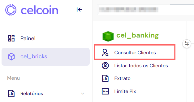 - No Painel do Cliente, acesse o menu lateral esquerdo, em cel_bricks > Consultar Clientes, digite o documento, Número de conta ou Nome do cliente, em seguida clique em buscar: