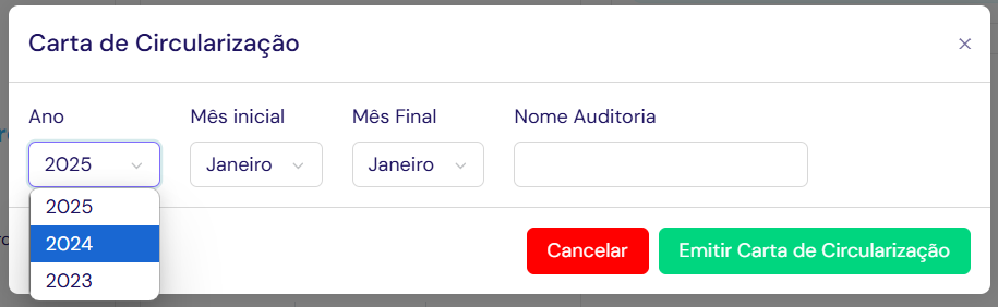- Selecione o período (mês/ano) e preencha o nome da auditoria responsável (opcional). Para finalizar, clique em 'Emitir Carta de Circularização: