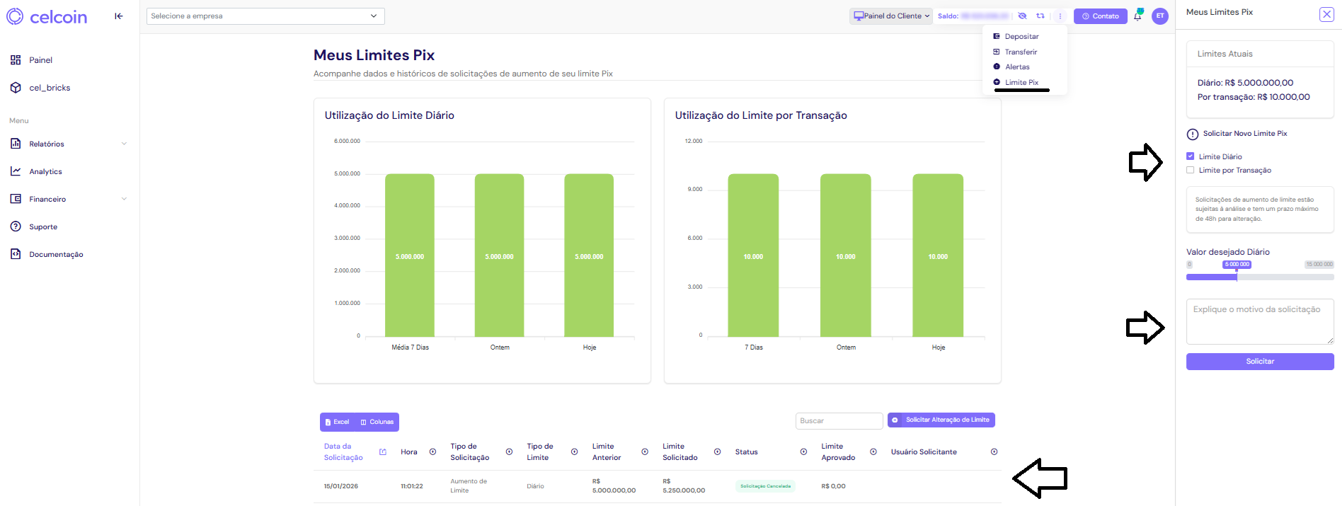 Você pode monitorar e ajustar seus limites Pix com total autonomia através do Painel do Cliente. Basta acessar o menu: cel_bricks > Limite Pix.