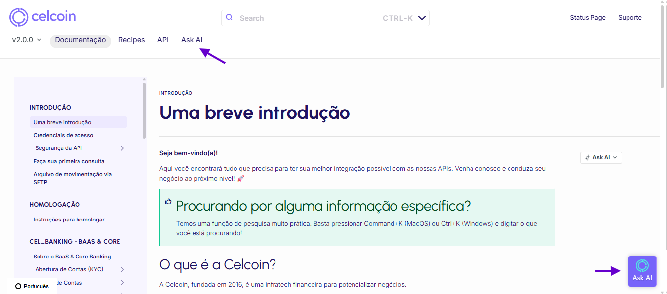 O Celcoin AI Assistant (Ask AI) é um agente de inteligência artificial treinado com toda a nossa documentação técnica e FAQs. Ele foi criado para sanar dúvidas rápidas sobre o funcionamento dos nossos produtos de forma instantânea.