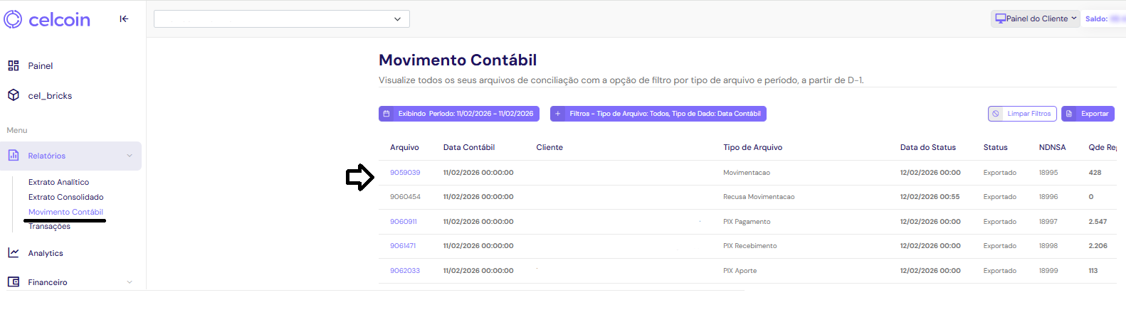 O relatório 'Repasse/Arquivo Exportação' mudou de nome e agora se chama Movimento Contábil. Para acessá-lo, vá ao menu: Relatórios > Movimento Contábil. Após selecionar o período, clique em 'Arquivo' para gerar o relatório das transações correspondentes.